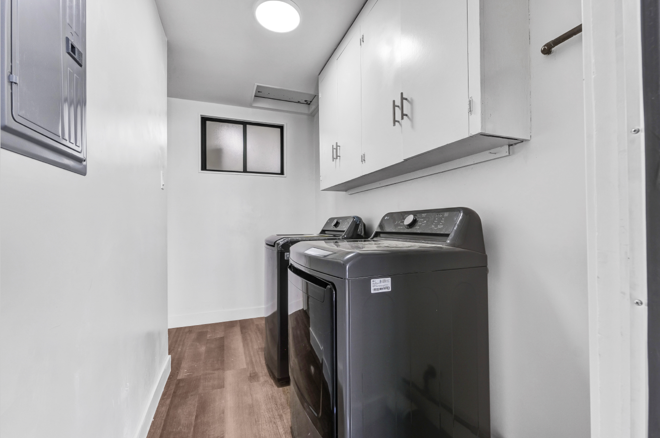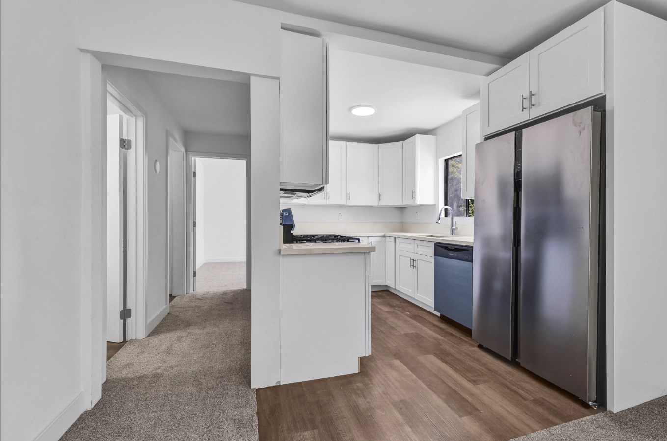 Bright and spacious Property with functional kitchen, refrigerator, dishwasher, and microwave, 2 comfortable bedrooms and 1 full bathroom across approximately 1,170 sq ft with stylish carpet and hardwood flooring,| Washer/dryer hookups and forced-air heating included, One off-street parking space & tenants are responsible for utilities and services. NO PETS ALLOWED